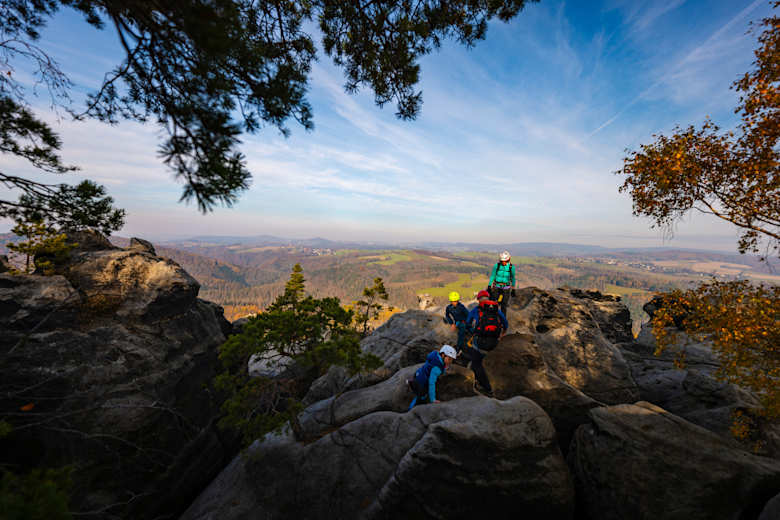 Ausstieg aus dem Kamin des Häntzschelstiege-Klettersteig an den Affensteinen, auf das Riff, im Hintergrund Falkenstein-Turm Foto: Hannes Tell / Red Bull Media House Publishing