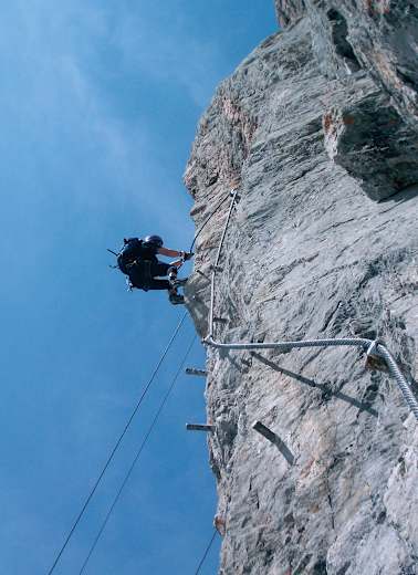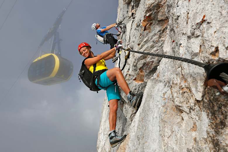 Spektakulär, luftig und sehr kraftraubend: Der Sky-Walk-Klettersteig (Schwierigkeitsgrad E) ist in punkto Ausgesetztheit eine Klasse für sich und ehrt seinen Namen. Wer über Mut und die entsprechende Zusatz-Portion Schmalz in den Oberarmen verfügt, darf sich unweit der Bergstation der Dachstein-Seilbahn über ein Klettersteig-Abenteuer freuen. Am Stahlseil geht es über sehr steile bis überhängende Felspfeiler - oft bestaunt von den Passagieren in der darüber schwebenden Gondel - durch die Felswände der Dachstein-Gruppe in der Steiermark.