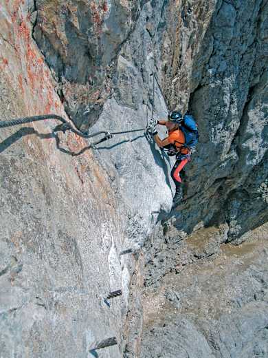 Mehrere Passagen erreichen - im Bereich des teilweise überhängenden Pfeilers sogar in kurzen Abständen - den Klettersteig-Schwierikeitsgad D/E. Diese sind als extrem schwierig einzuordnen. Nach der langen Einstiegsquerung vom Hunerscharten-Steig geht‘s ordentlich zur Sache, zum Rasten kommt man bei den anhaltenden Schwierigkeiten kaum. Kraftausdauer ist in sehr hohem Maße erforderlich, eine Kurzfixierung (kurze, zusätzliche Bandschlinge mit Klettersteig-Karabiner oder 1-2 Expressschlingen) zur Armentlastung ist sehr zu empfehlen. Kletterschuhe (ohne Profil) oder spezielle Klettersteig-Schuhe (an der Schuhspitze profillos) für bessere Reibung auf den Tritten sind von Vorteil.