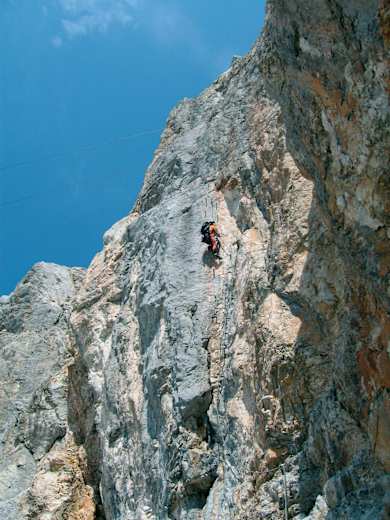 Es gibt zwar am Beginn der langen Einstiegsquerung einen kleinen Anseilplatz, es wird aber empfohlen, das Klettersteigset bereits in der Hunerscharte anzulegen.