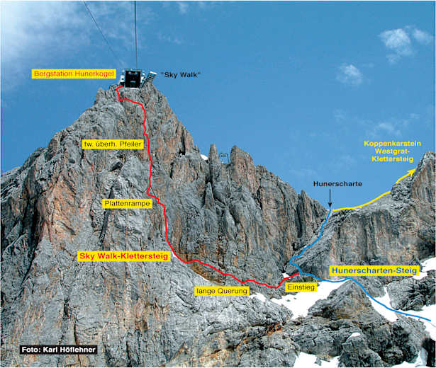 Von der Hunerscharte über den Hunerscharten-Steig die Plattenrampe südlich weiter abklettern (gesichert, A-B) bis zur Abzweigung des Sky-Walk-Klettersteiges (dort wo sich der Hunerscharten-Steig am unteren Ende der Plattenrampe nach links in Richtung Obere Schwadering wendet). Man kann zum Klettersteig auch von der Talstation zusteigen, wie im GPX-Track beschrieben.