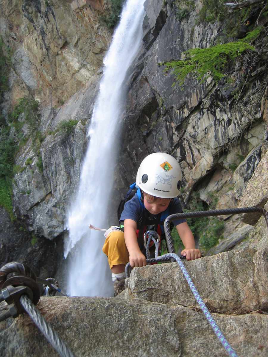 Toller Einsteigerklettersteig (B/C, Variante D/E) entlang des Lehner-Wasserfalles im Ötztal in Tirol. Vom Ötztaler Heimatmuseum steigt man an insgesamt 14 Kreuzweg-Stationen vorbei bis zu einer Hängebrücke, hinter der bereits der Einstieg wartet. Direkt am Wasserfall entlang genießt man die malerischen Ausblicke in Ötztal. Die überhängende Schlüsselstelle (D/E) kann mit der Variante nach links leicht umgangen werden und ist somit bestens für die gesamte Familie geeignet.