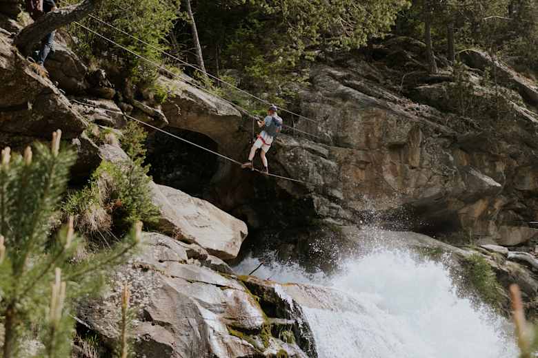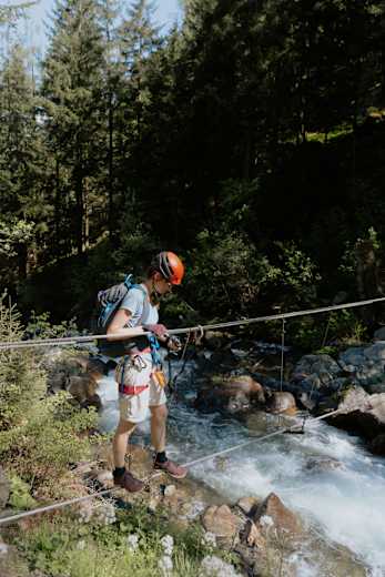 Stuibenfall Klettersteig - gleich zu Beginn geht es über eine Seilbrücke über den Bach Foto: Annika Manthey