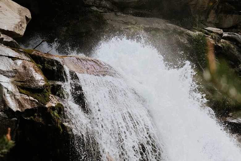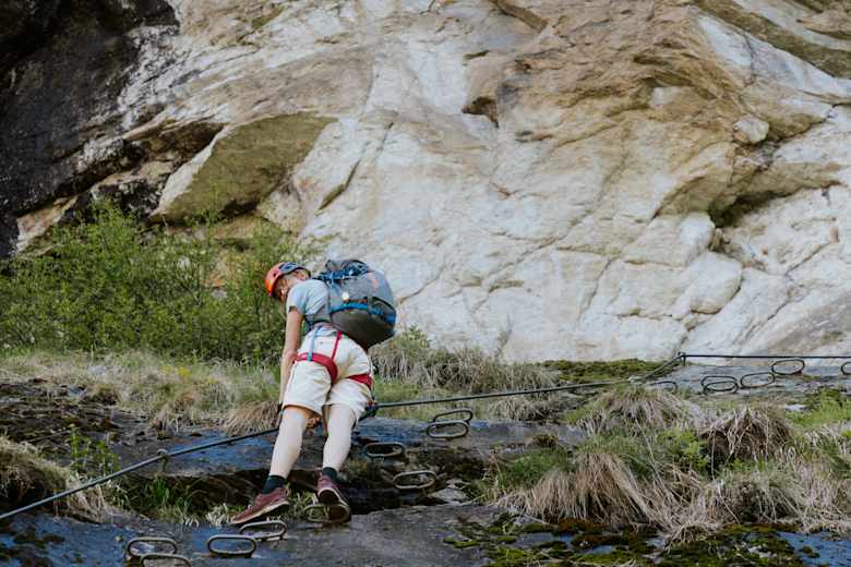 Nun wird es steiler: Es geht los mit einer glatten Felsplatte. Nach einer kurzen Querung folgt dann an einer steilen Verschneidung die Schlüsselstelle des Steigs, ein Aufschwung samt kurzem Überhang (C, gut sicherbar mit Kindern). Zwei weitere Felskanten (B/C und B) müssen überwunden werden, dann hat man die schwierigsten Stellen des Steigs geschafft. Nach einer Pause beim Wandbuch, geht es direkt am Wasserfall entlang hinauf zur Aussichtsplattform. Ausstieg hier möglich oder Querung des Baches mittels spektakulärer Seilbrücke. Nun über den einfachen Steig hoch zum Wanderweg.