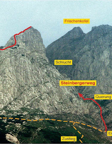 Über den Koban-Prunner-Weg (B/C) 2- und den Weg der 26er (D) 1+ auf die Hohe Warte (2.780 m).