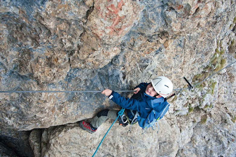 Der neu angelegte und bestens gesicherte Klettersteig mit seinem kurzen Zu- und relativ kurzen Abstieg ist sehr beliebt, was besonders an Wochenenden zu beträchtlichen Staus und Wartezeiten führen kann! Dieser Aufstieg ist für die kleinen Kraxler eine Herausforderung, da es gleich schon richtig „losgeht“. Bewegungsfreudige Kinder schaffen die Route problemlos! Der Begleiter muss über eine gute Erfahrung am Klettersteig verfügen. Komplette Klettersteigausrüstung für alle Beteiligten sowie eine zusätzliche Sicherung der Kinder mit einem Seil wird vorausgesetzt. Man sollte maximal zwei Kinder ans Seil nehmen!