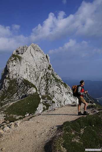 Vom Parkplatz folgen wir dem beschilderten, breit ausgetretenen Weg nach Osten. An einer Kante haben wir einen prachtvollen Blick nach Norden, hinunter zu den Laghi di Fusine, zwei tiefblauen Seenaugen. Auf unserem Weiterweg teilen sich schon bald die Routen, 2.245 m: links der Normalweg; wir gehen aber rechts zum Klettersteig und queren im Schottergelände 10 Min. zum Einstieg.
