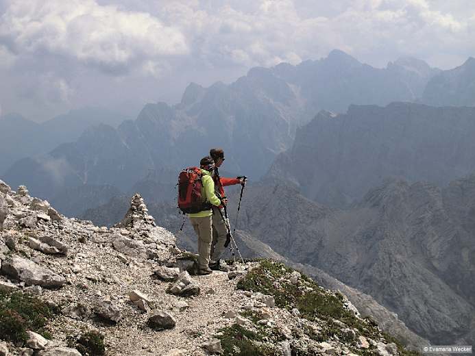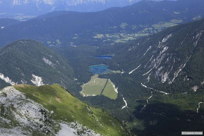 An einer Kante haben wir einen prachtvollen Blick nach Norden, hinunter zu den Laghi di Fusine, zwei tiefblauen Seenaugen. Foto: Evamaria Wecker, Rother Bergverlag