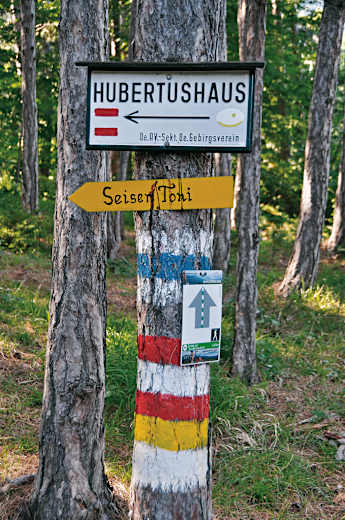 Nun durch stärker bewaldetes Gelände weiter abwärts, kurz dem Wandfußsteig nach rechts folgend, über eine Schutthalde. Bald darauf kreuzen wir einen Forstweg. Über mehrere kleinere Lichtungen zu einem zweiten Forstweg hinunter, hier rechts (Wegweiser „Seiser Toni", nun blau markiert) und schon bald zur gleichnamigen Frühstückspension. Von hier entweder über den Fahrweg weiter Richtung Grünbach (blau markiert) oder – schöner – bereits in der ersten Rechtskurve des Fahrwegs auf einen halb links abzweigenden, unmarkierten Waldpfad und bis zu einem schwach ausgeprägten Graben.