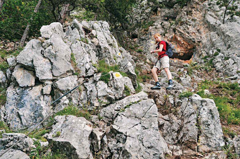 Über den gelb markierten Wagnersteig, der östlich der Großen Kanzel bei einer knorrigen Föhre am Rand der Hochfläche (Wegweiser am Baum) beginnt. Über acht Leitern und etliche seilversicherte Passagen – unter Ausnutzung der Schwachstellen des Geländes – über Bänder, Rinnen und felsige Rücken über eine fast 100 m hohe schrofige Steilstufe abwärts; einige kurze Stellen etwas ausgesetzt. Auf 950 m Höhe wieder etwas flacher.