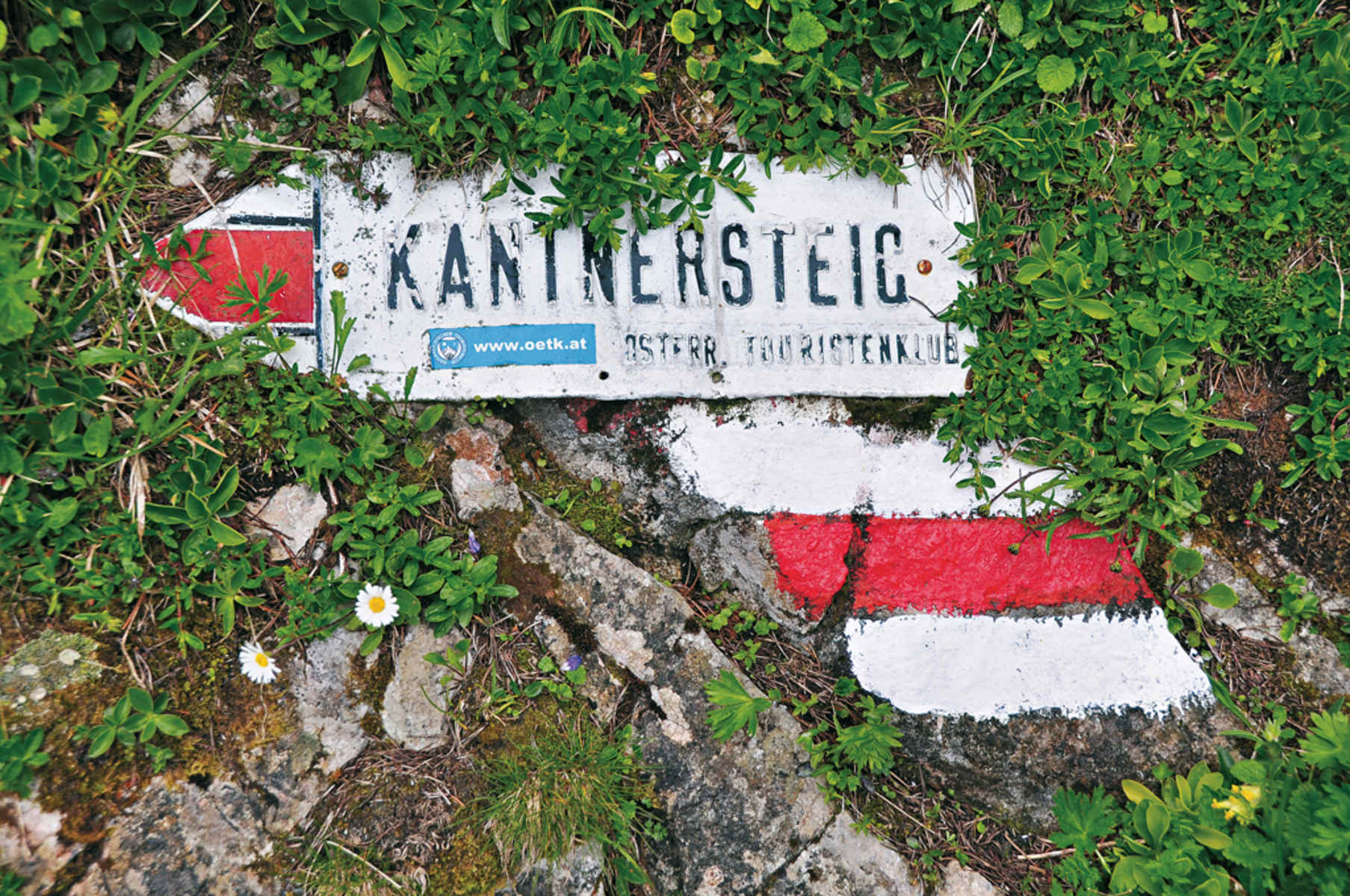 Über eine kurze erdige Rinne auf eine nach rechts (Südwesten) hinaufziehende Rampe, über diese mittelsteil immer höher in die Kahlmäuer hinauf. Bei einem felsigen Eck folgt die nächste leichte (und versicherte) Kletterstelle. Die Rampe geht in eine steile, aber gut gestufte und versicherte Rinne über, die man mit einigen Kletterschritten überwindet (links und rechts Latschen). Über zwei etwas ausgesetzte Querungen (Drahtseil) in den obersten Teil der Wand, nun über ein Bändersystem kurzweilig weiter aufwärts (Seilsicherungen) bis zum Plateaurand (1.640 m). Hier lädt eine kleine Wiese zum Verweilen ein.