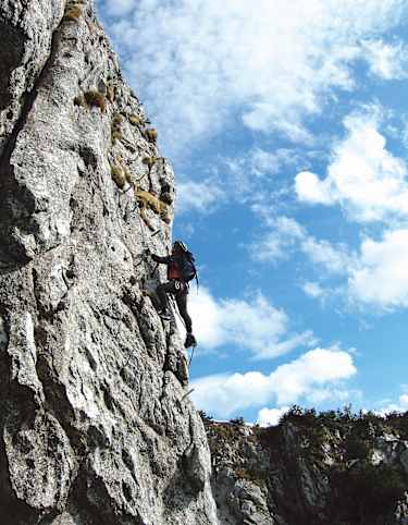Soll es hingegen „eisenhaltiger" sein, so bietet sich die hier vorgestellte Tour an. Den landschaftlich äußerst eindrucksvollen Anstieg vermittelt dabei die Wildfährte durch den nordöstlichen Teil der Kahlmäuer. Schon im Zustieg durch das idyllische Reißtal mit seinen Blumenwiesen, wandert man auf die spektakuläre Felskulisse der Kahlmäuer zu. Die mächtige und überhängende Bärenlochmauer der nördlichen Kalkalpen, der luftige Quergang ins Bärenloch, der die Schwindelfreiheit testet, etliche anregende Kletterpassagen, gepaart mit einer umfassenden Aussicht, vor allem in die Mürzsteger Alpen – all dies verbindet sich zu einem eindrucksvollen alpinen Erlebnis.