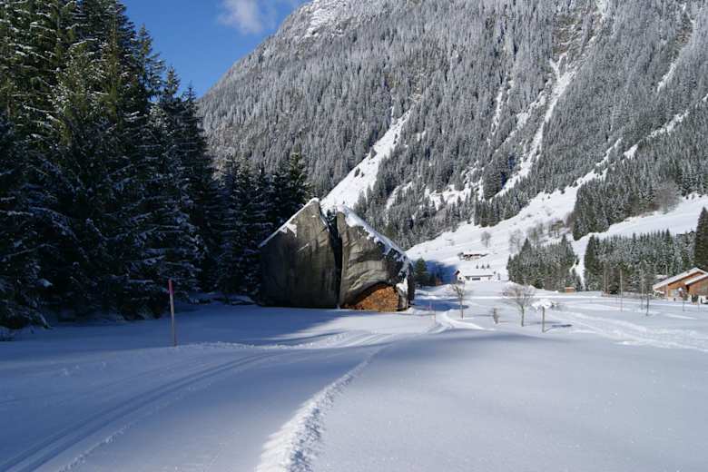 Eingebettet in traumhafte, tiefverschneite Winterlandschaft führt die Route an der „Gufelste" (Gufelstein) vorbei, einem riesigen gespaltenen Felsbrocken.