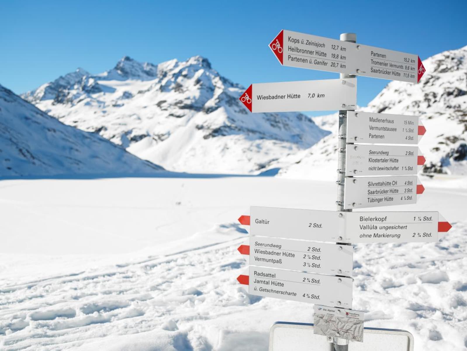 Die „Große Höhenloipe" startet beim Gasthof Piz Buin auf der Bieler Höhe und führt an der Barbara Kapelle vorbei in Richtung Vermuntsee.