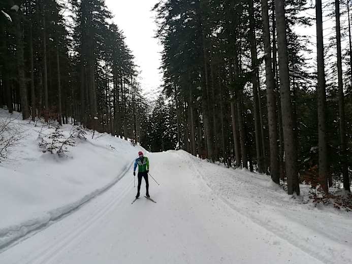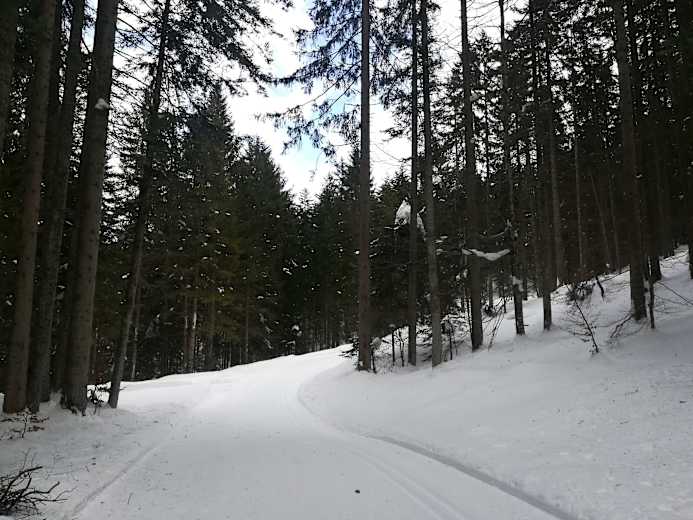 Die Loipe C8 führt von Muggenmoos nach Wildmoos zum Golfplatz. Dabei sind einige kurze aber sehr steile Passagen zu überwinden.