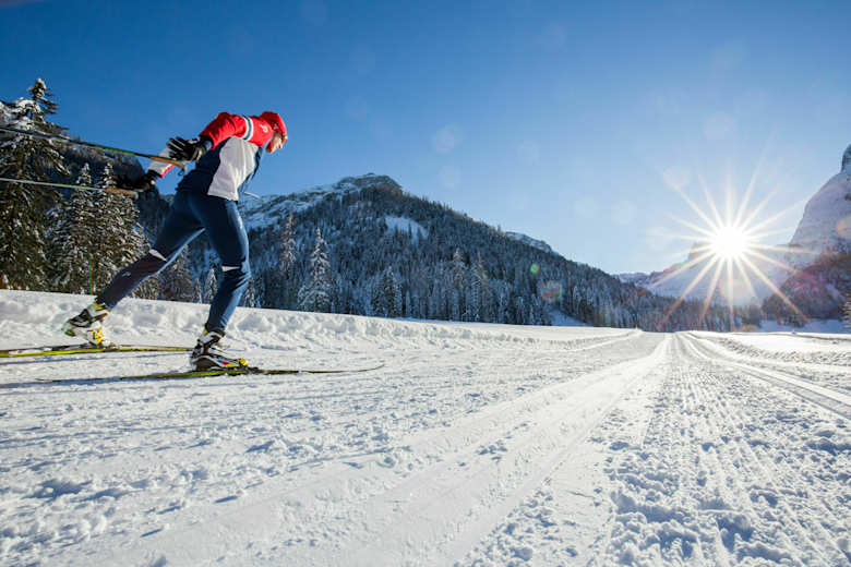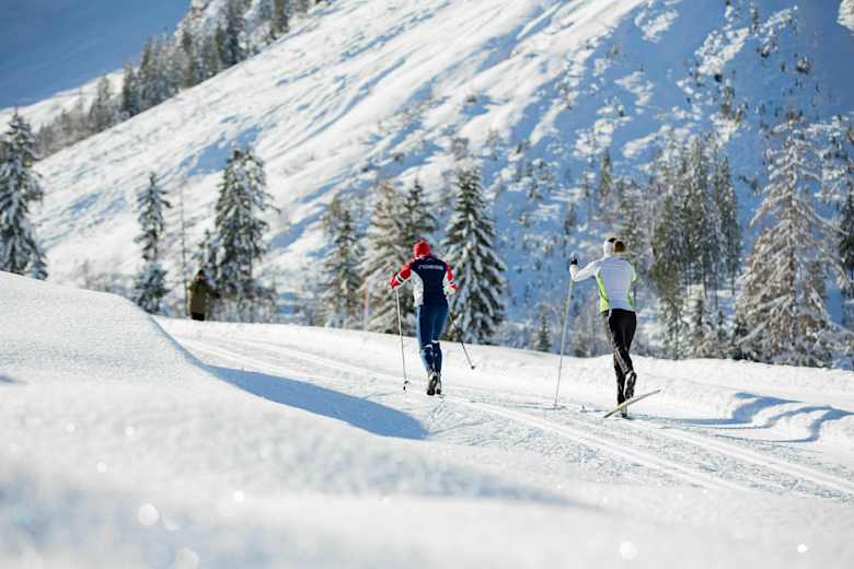 Eine gute Mischung aus Ausdauer, Kraft und Technik erfordert die mittelschwierige Loipe Falzthurn Gramai am Achensee in Tirol. Auf rund 14 km geht es vom Eingang der Karwendeltäler durch das Falzthurntal bis zum Talkessel Gramai.