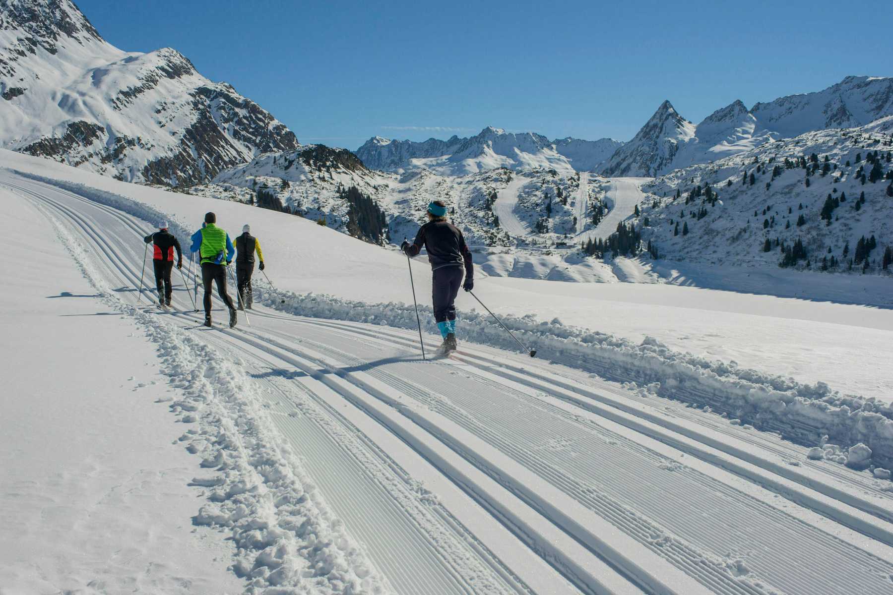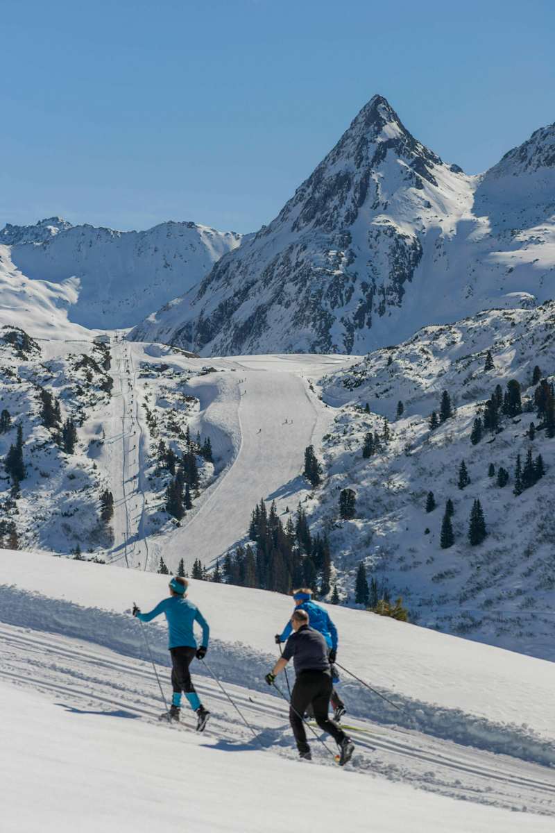 Die Zeinis-Kops Route an der Grenze zwischen Tirol und Vorarlberg gehört wohl zu den schönsten Loipen des Paznaun. Bewacht von den Riesen der Silvrettagruppe und mit Blick zu den Zeinis- und Kopsstauseen läuft es sich hier ausnehmend idyllisch dahin.