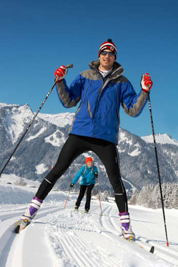 Langlaufspaß in der Naturparkregion Reutte. Diese leichte Rundloipe in den Lechtaler Alpen verläuft in einer Runde in der Nähe des Gasthofes Kreuz in Rieden.