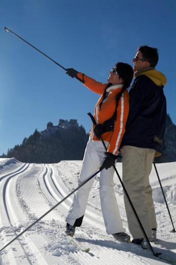 Langlaufspaß in der Naturparkregion Lechtal-Reutte in Tirol. Diese leichte und sonnige Loipe in Reutte, umgeben von den Allgäuer und Lechtaler Alpen, bietet viele Möglichkeiten. Die Strecke ist klassisch präpariert.