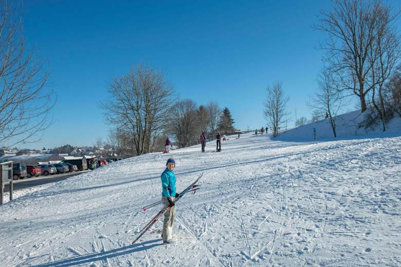 Nach einem kurzen Waldstück gleitet man auf der Loipe immer am Waldrand entlang, bis man einen gespurten Forstweg erreicht. Auf diesem wandert man bis zum Abzweig am Bolberg. Nach rechts sind es nur ein paar Meter bis auf den Gipfel des aussichtsreichen Berges. Die aufgestellten Bänke ermöglichen eine gemütliche Rast bei herrlichem Sonnenschein.