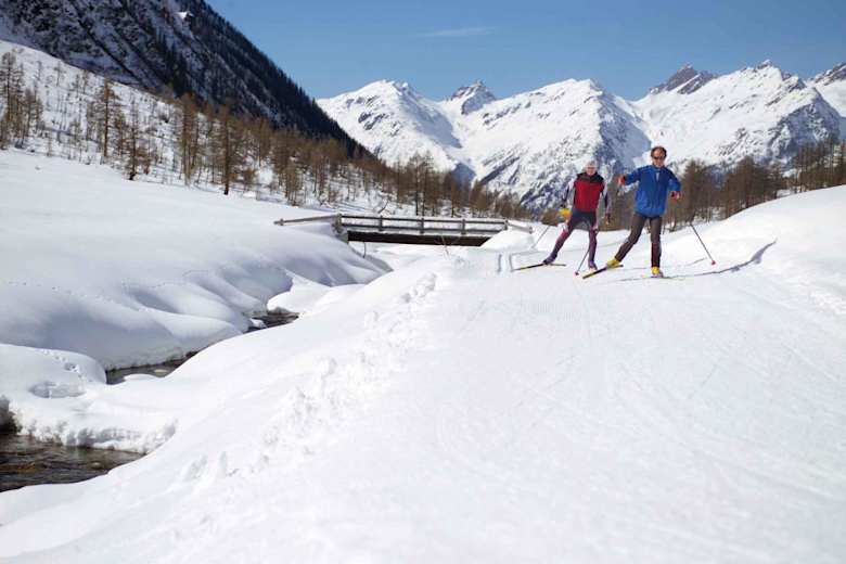 Diese Langlauf-Loipe im Lötschental in den Berner Alpen im Oberwallis ist mehr als bloß eine Verbindung zwischen den beiden Dörfern Wiler und Blatten. Dazu ist sie einfach viel zu schön. Die Verbindungsstrecke kann man im klassischen oder Skating-Stil in Angriff nehmen.