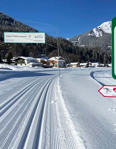 Nachdem man den Fluss überquert hat, biegt man zweimal rechts ab und erreicht das Langlaufzentrum, nahe dem Bahnhof.