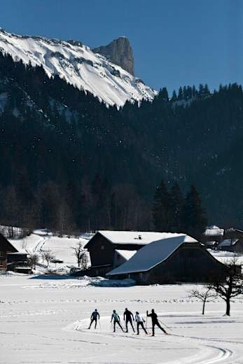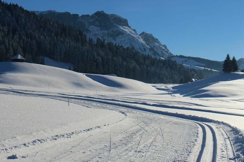 "Langlaufen, wo Olympia-Medaillengewinner zuhause sind" - Die Hausstrecke der schweizer Langlauf-Legende Sepp Haas befindet sich inmitten der idyllischen Berglandschaft der UNESCO Biosphäre Entlebuch. Stets im Blick ist die Schrattenfluh mit ihren vier markanten Gipfeln: Hengst, Schibengütsch, Hächle und Strick.