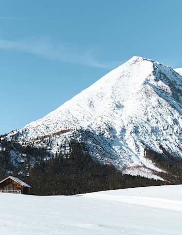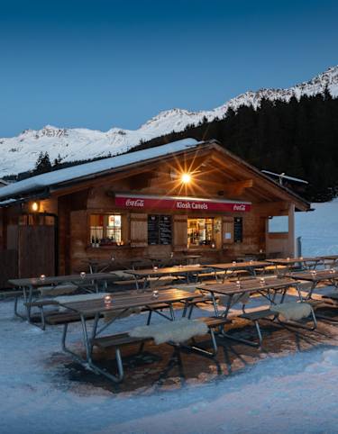 Unterwegs lädt die Sonnenterrasse des Kiosks in Canols zum Rasten und Verweilen ein. An sonnigen Tagen ist dies das perfektes Plätzchen, um die schöne Aussicht auf den winterlichen Heidsee zu geniessen.