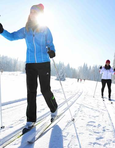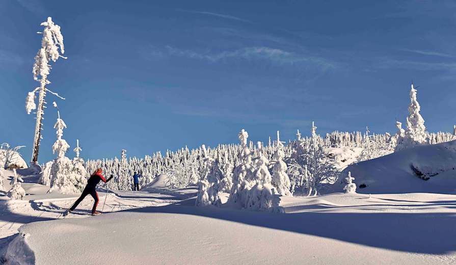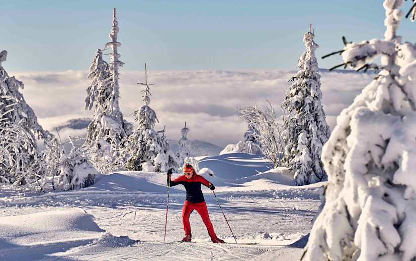 Ausgehend vom Langlaufzentrum Bretterschachten in Bodenmais im Bayerischen Wald ist die Auerhahn Höhenloipe auf jeden Fall ein absolutes Highlight. Rund 20 km sind bis zum Ziel in Schareben zu bewältigen. Den Stil kann man frei wählen, denn die Loipe wird sowohl klassisch als auch für Skating-Freunde gespurt.