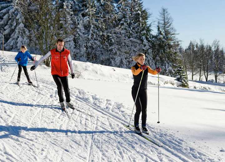 Die Hirschlacke-Loipe nahe Ulrichsberg im Böhmerwald in Oberösterreich besticht durch ihre schönen Aussichtspunkte. Sie ist klassisch und im Skating-Stil gespurt.