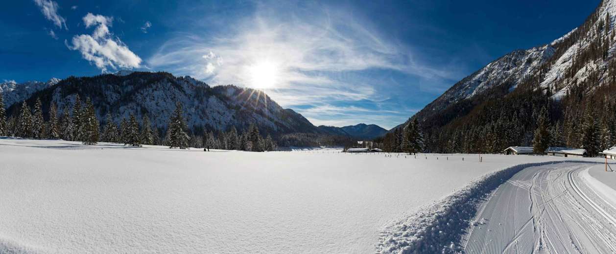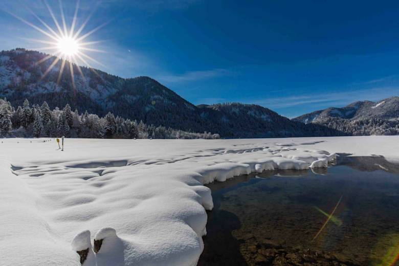 Die Sonnen Loipe hat ihren Ausgangspunkt beim Mittersee im bayerischen Chiemgau. Sie umrundet die wunderschön verschneiten und zugefrorenen Seen - den Lödensee und den Mittersee.