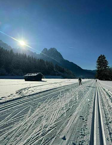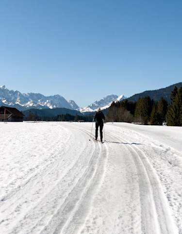 Diese traumhafte Langlaufloipe schlängelt sich zwischen Krün und Wallgau über die sonnigen Wiesen. Begleitet wird man dabei vom tollen Bergpanorama der Alpenwelt Karwendel. Besonders schön ist der Blick auf den winterlichen Barmsee mit dem Karwendelgebirge im Hintergrund. Die Loipe wird klassisch und im Skating-Stil gespurt und ist leicht bis mittelschwer.