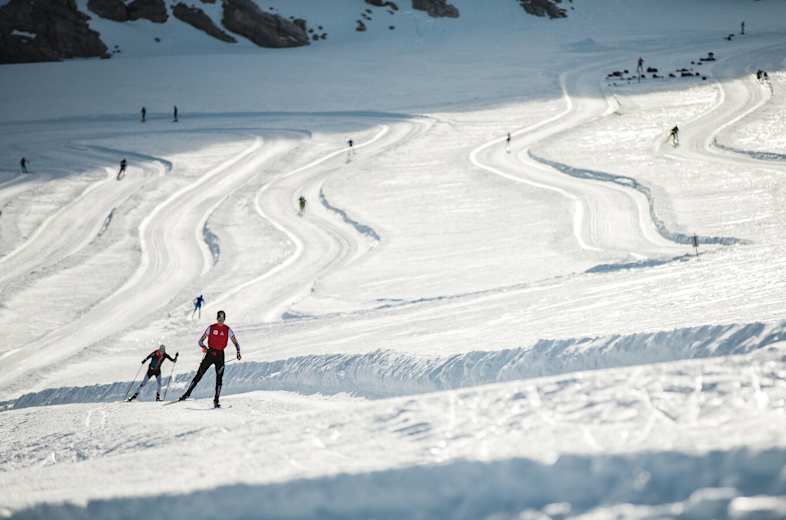 Etwas unterhalb der Bergstation der Seilbahn befindet sich der Einstieg in die Gletscherloipe. Auf 10 Kilometern, die in Schleifen über den Gletscher zwischen Gjaidstein und Eisstein führen, kann man die hochalpine Landschaft genießen und sich dabei sportlich fordern.