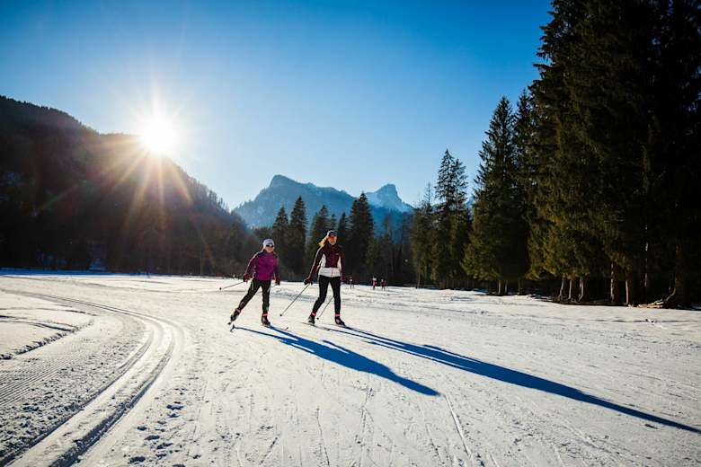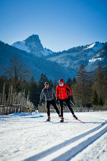 Die Loipe Sichernwiese ist eine ideale und schneesichere Übungsloipe bei Ruhpolding im Chiemgau. Der Einstieg befindet sich gegenüber der Chiemgau Arena.