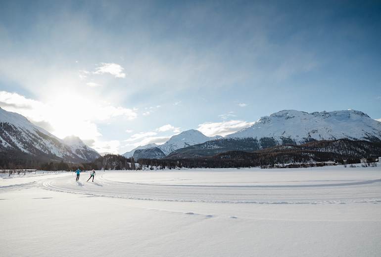 Die Herzloipe inmitten der sonnenverwöhnten Talebene von Celerina führt an der Kirche San Gian mit ihren markanten zwei Türmen vorbei und im weiten Bogen über den Golfplatz Samedan zurück zum Ausgangspunkt.