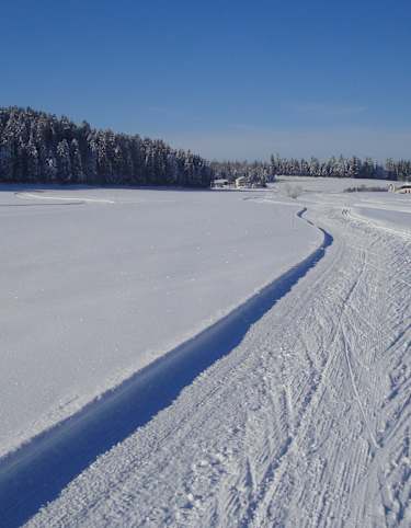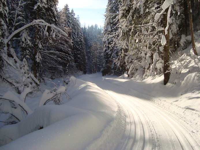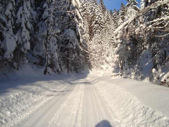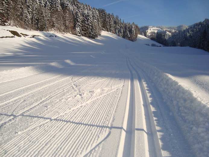 Auf 4.2 km werden für klassisch Läufer:innen und für Skater:innen Spuren angelegt. Ganz zu hinterst führt die Strecke auf dem Weg dem Bach entlang in den Kurzengraben. Hier ist 1.2 km nur die klassische Spur angelegt.