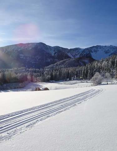 Die Rundloipe Feistritzsattel (Loipe Nr. 8) umfasst eine Strecke von etwa 9,5 Kilometern und bietet ein herrliches Panorama auf die umliegenden Berge (Rax, Schneeberg, Stuhleck).