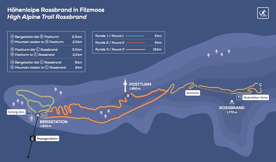 Am Rossbrand bei Filzmoos im Salzburger Land befindet sich ein insgesamt 16 Kilometer langes Höhenloipennetz mit drei Routen, das sowohl im klassischen als auch im Skating-Stil gespurt wird. Neben den perfekten Loipen begeistert auch das 360 Grad Panorama auf die rund 150 markanten Berggipfel und die unvergleichliche Winterlandschaft. Ausgangspunkt der Loipen ist die Bergstation der Papageno-Gondelbahn, die Langläufer und Skifahrer in nur 7 Minuten vom Ort hinauf auf den Rossbrand bringt.