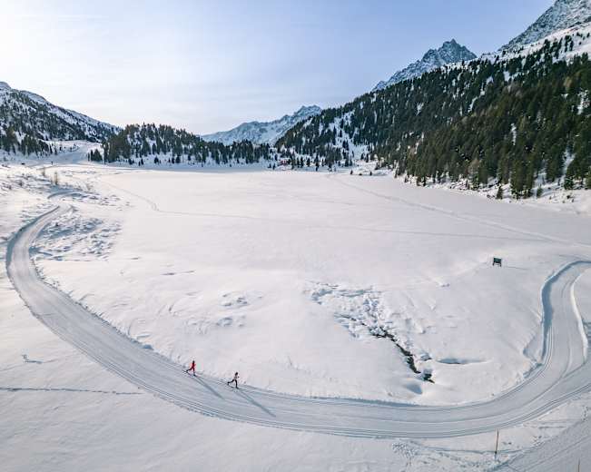 Die im Rundkurs verlaufende, kupierte Obersee Loipe startet beim Umkehrplatz des Skibusses und verläuft in Richtung Staller Sattel. Entlang des Ufers des Obersees führt die Loipe zur Oberseehütte und zurück zur Panoramatafel beim Parkplatz.