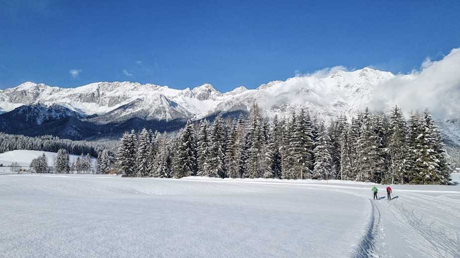 Der Loipe folgend läuft man eine schöne flache Runde, bis man zur Wildmoosalm kommt. Weiter geht es über das Wildmoosplateau entlang der B3 und C11 zur Lottenseehütte. Nach einem steilen Anstieg und biegt man in die C6 und anschließend die C10 ab. Mit kurzen Gegenansteigen läuft man nun rasant hinab bis zum Leutascher Ortsteil Moos. Beim Langlaufparkplatz wechselt man auf die A5 und gleitet entspannt durch das weite Leutaschtal. Von der A5 wechseln wir dann auf die A6 Alpenbad. Entwederwir bleiben auf der Loipe, immer entlang der Leutascher Ache, bis wir zum Ganghoferbogen beim Fußballplatz kommen, oder wir wechseln noch einmal von der A6 auf die A2 Snowfarming-Loipe. Diese verläuft noch einmal durch ein Waldstück, bevor man amAlpenbad Leutasch vorbeikommt und durch eine Unterführung bis zumGanghoferbogen gelangt.
