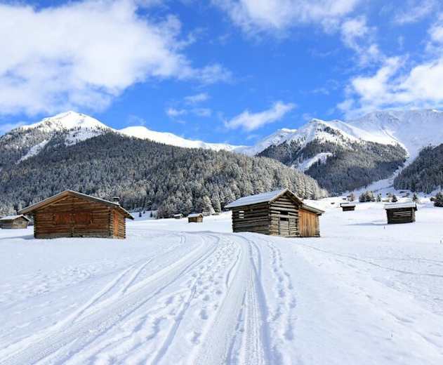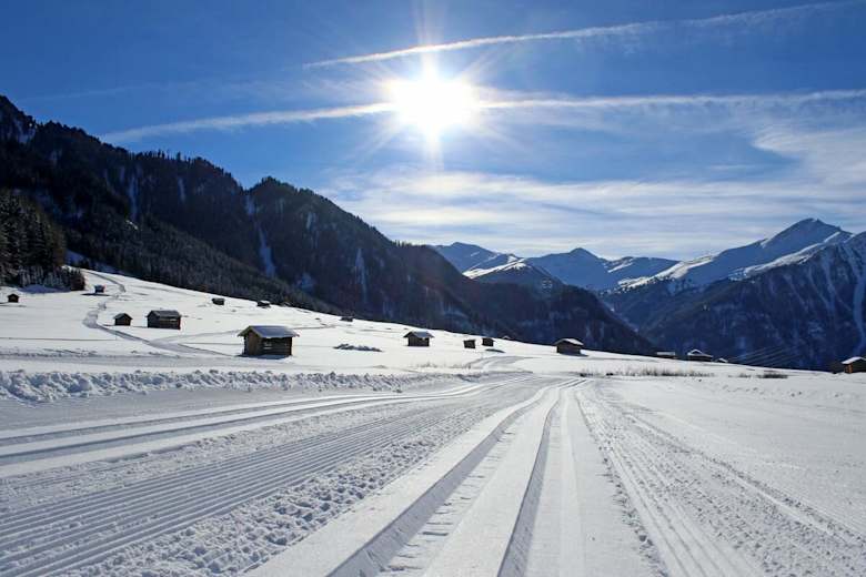 Einstieg in die Höhenloipe ist der Parkplatz Tscheylücke. Von hier zieht die Loipe über die tiefverschneiten Wiesen mit den vielen Heustadeln, die charakteristisch für die Tschey sind. Dazu genießt man zudem ein wunderbares Bergpanorama.