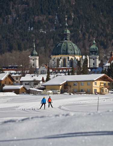Aussichtsreiche Langlaufloipe in der Zugspitzregion in Bayern. Der familienfreundliche Rundkurs verläuft zwischen Oberammergau und Unterammergau. Die Loipe, mit schönem Blick auf das Ammertal, ist klassisch und für die Skate-Technik gespurt.