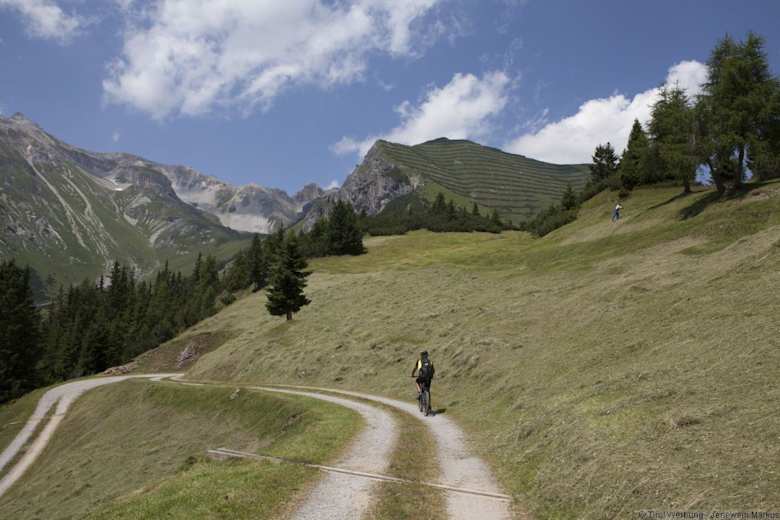 Die typischen „Bergmähder" des Blasers, die sich im Frühsommer in einem Meer von Alpenblumen präsentieren, und der herrliche Blick ins Tal nach Steinach entschädigen den Bergradler für die zwar langen, aber nicht so steilen Anstiege auf dieser Tour über die Zwieselmähder (1.860 m) zum Loosjoch. Die Abfahrt erfolgt entlang der Auffahrtsstrecke. Das letzte Stück zur „Blaserhütte" ist nicht befahrbar (Schiebestrecke etwa 20 Minuten).