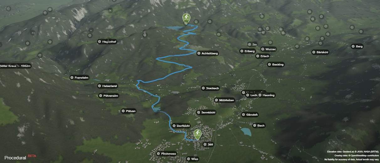 Von Söll am Wilden Kaiser geht es Richtung Norden zum Franzlhof. Nach dem Gasthaus nimmt man die Abzweigung nach Rechts zum Moorsee und fährt weiter nach Oberstegen und auf den Achleitberg. Dem Weg führt im Zick Zack aufwärts am Achleitkogel vorbei zum Gasthaus Achleiten und über Greidern geht es dann gemütlich bergab zum Hintersteinersee.