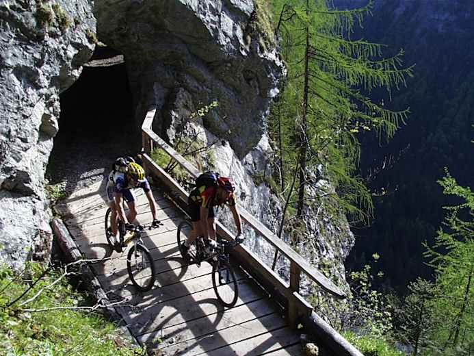 Die Achensee-Region in Tirol fasziniert durch die Kombination von See und Berg. Die MTB-Strecke zur Bärenbadalm (1.475 m) im Karwendel führt durch das idyllische Dristenautal und bietet besonders malerische Ausblicke.