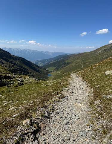Vom Ortsteil Astegg (1.187 m), Gemeinde Finkenberg, über einen gut ausgebauten Forstweg (Mark. 475) in mehreren langen Schleifen, vorbei am Gasthof Gschösswand (spektakulärer Ausblick auf Mayrhofen) zur Bergstation der Penkenbahn. Von hier taleinwärts vorerst leicht ansteigend durch Zirbenwälder, vorbei am Speicherteich Penken und Richtung Westen bis zum Penkenjoch (2.079 m). Anschlüsse über die Route 422 entweder weiter nach Tux oder abwärts durchs Horbergtal Richtung Schwendberg zur Zillertaler Höhenstraße.