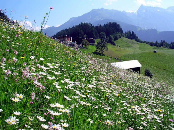 Mittelschwierige Verbindungsroute am Hoarberg, dem „Hohen Berg", oberhalb von Finkenberg im Zillertal in den Tuxer Alpen. Auf der knapp zwei Kilomenter langen Strecke, auf der man 100 Höhenmeter ansteigt, öffnet sich das Panorama auf die Tiroler Gebirgslandschaft von den Kitzbühler- bis zu den Zillertaler Alpen.
