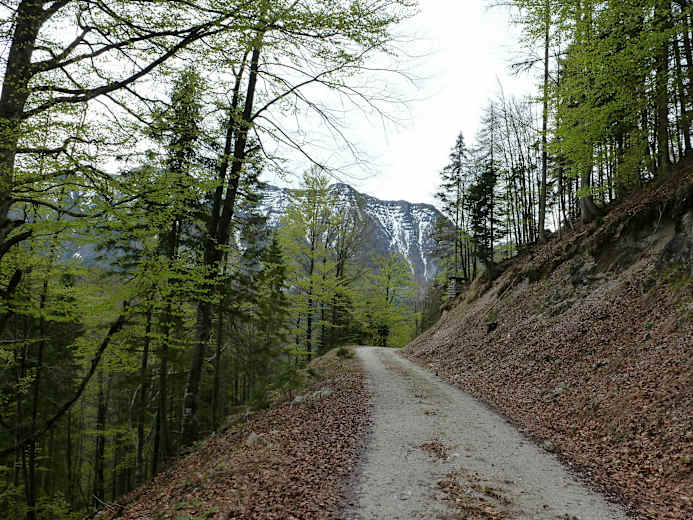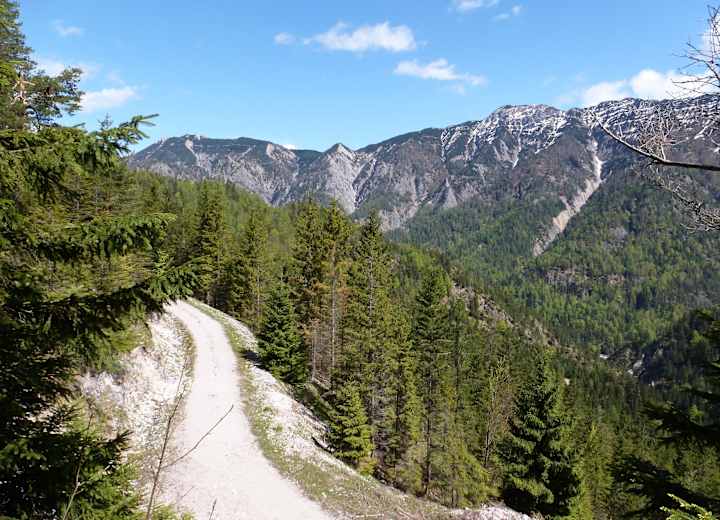 Die Route beginnt auf einer Schotterstraße und führt durchwegs auf Schotter zuerst hinauf zur Krumpenalm.