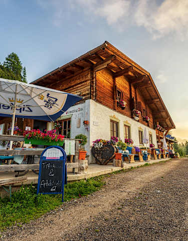Richtung Moosawald, links abbiegen, den Waldweg entlang mit Überquerung der Bundesstraße 189 nach Arzkasten- Weisland- durch das romantische Bachtal Richtung Aschland - rechts abbiegen weiter auf dem Forstweg hinauf zur Marienbergalm(1.622 m), wunderschöne Aussicht, durch herrliches Almgebiet weiter zum Marienbergjoch(1.789 m).