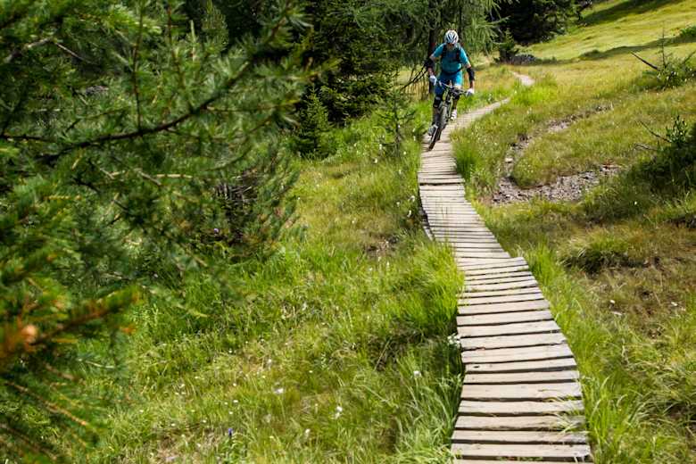 Von Nauders zunächst auf Asphalt, dann Forststrasse zur Norbertshöhe, dort Vorsicht bei der stark frequentierten Passstrassenquerung. Weiter mit schöner Aussicht ins Unterengadin zur Staatsgrenze und weiter abwechselnd auf Schotter und Wiesentrail bis oberhalb zum Schwarzen See. Vor dem See wird es knackig, Holzstege und Trailpassagen warten darauf gemeistert zu werden, im Zweifelsfall lieber schieben. Beim See angekommen erstmal verschnaufen und dieses Naturdenkmal geniessen. Zurück geht es auf Forststrassen mit teils loserem Schotter nach Nauders.